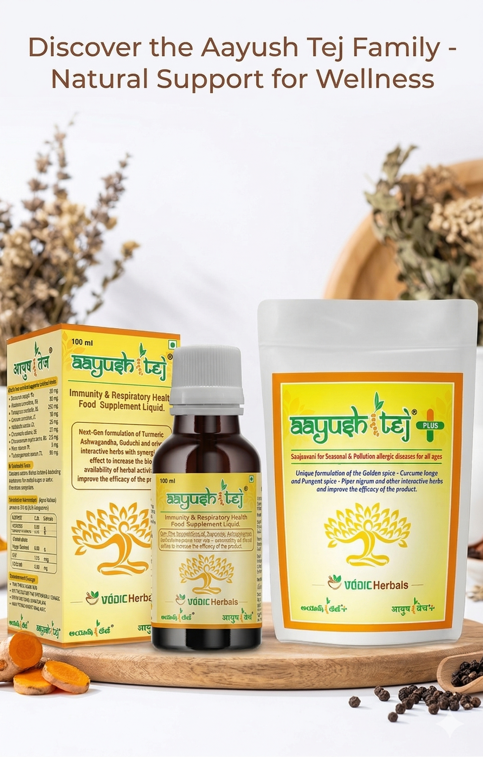 Support your immunity, respiratory health, and digestion with traditional herbal formulations made from Turmeric, Pepper, and Ajwain. Choose the convenience of Aayush Tej Syrup or the versatility of Aayush Tej Powder for complete family wellness.